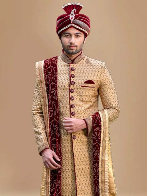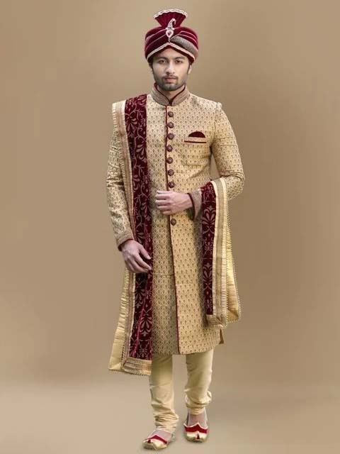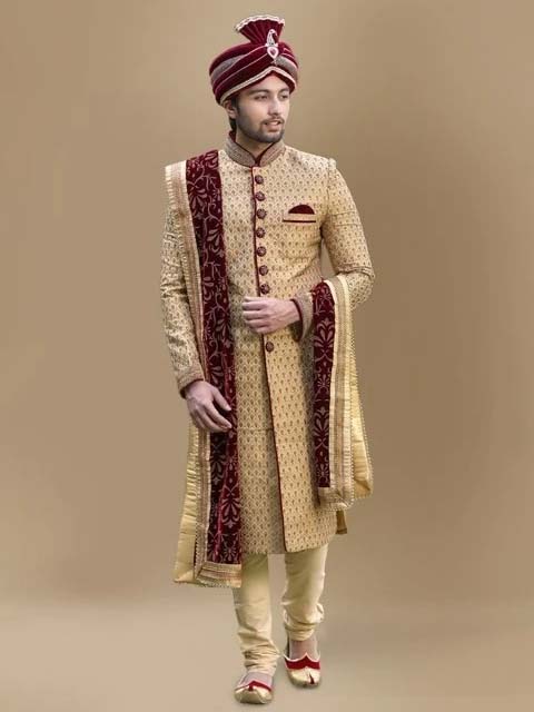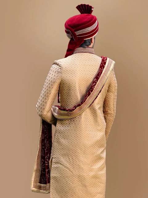 A traditional Aristocratic Fawn Groom Sherwani Suit that celebrates your roots