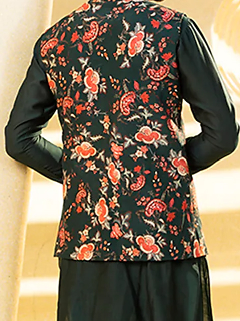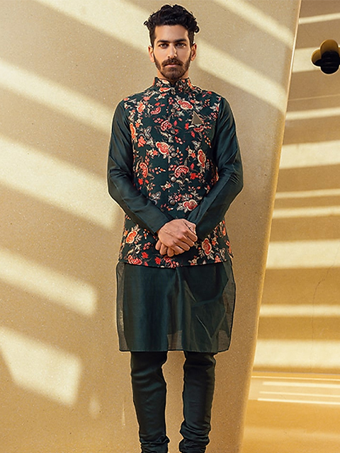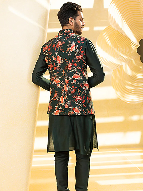 Bottle Green Kurta Set With Bundi Jacket