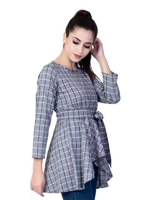 A black Checkered top crafted in cotton features a collar neck, 3/4th roll-up sleeves, a curved hemline, and a regular fit.