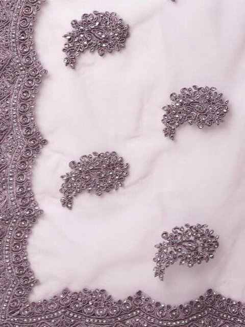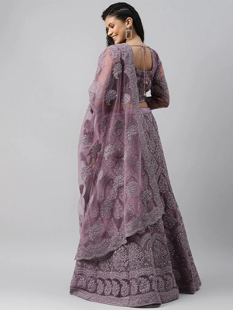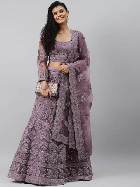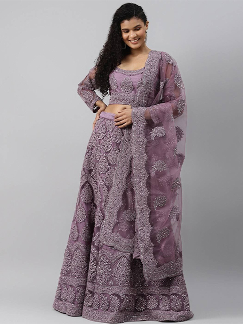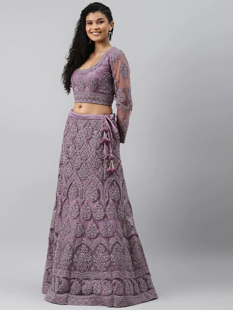 purple embroidered unstitched blouse, sleeveless, purple printed semi-stitched lehenga, has zip closure, flared hem