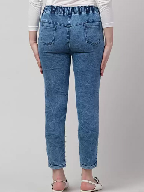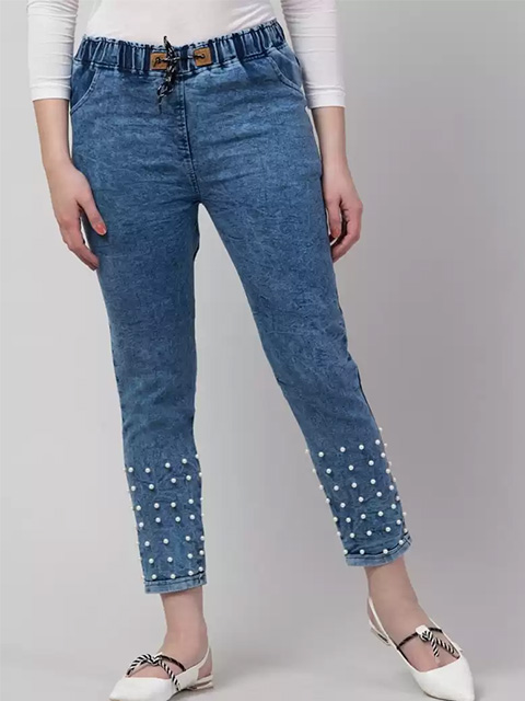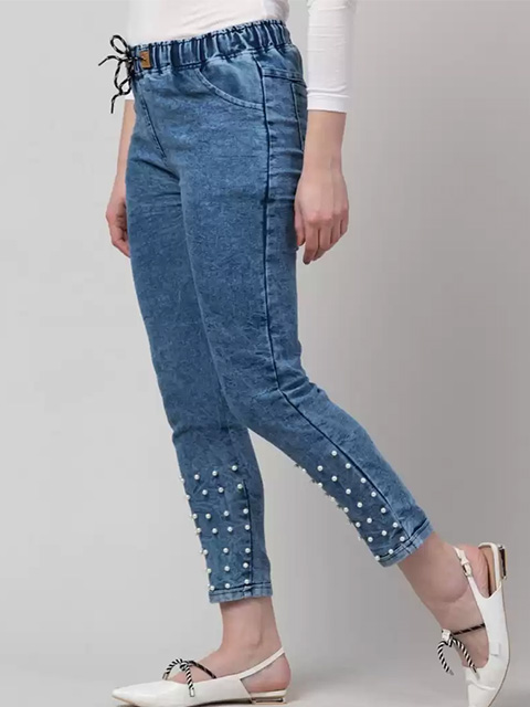 Women Denim Pearl Studded Jeans for Girls Matte Blue Pearl Studded Jeans.