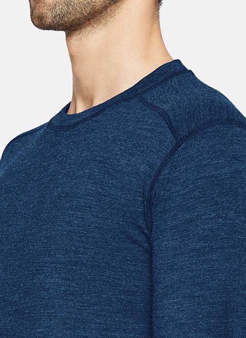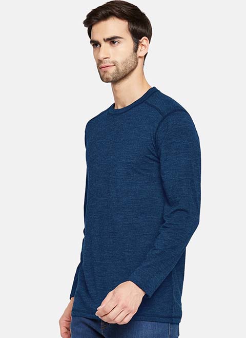 Blue knitted thermal T-shirt, has a round neck, long sleeves