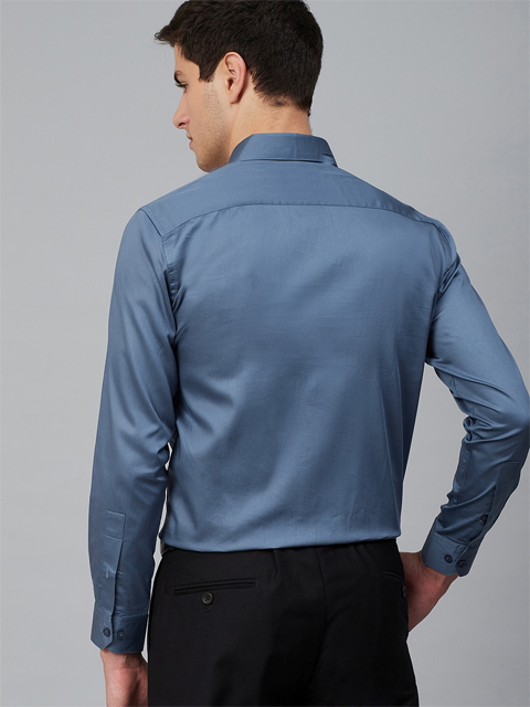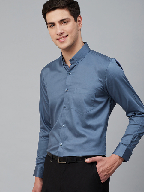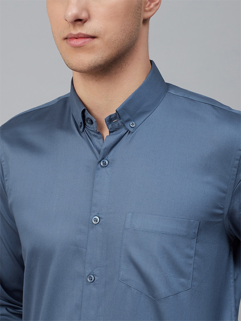 Blue solid formal shirt, has a button-down collar, long sleeves, button placket, curved hem, and one patch pocket