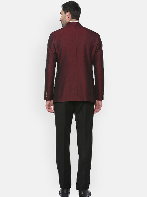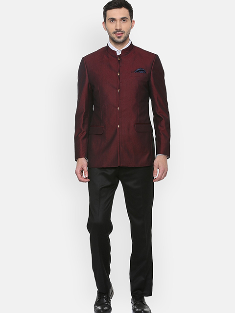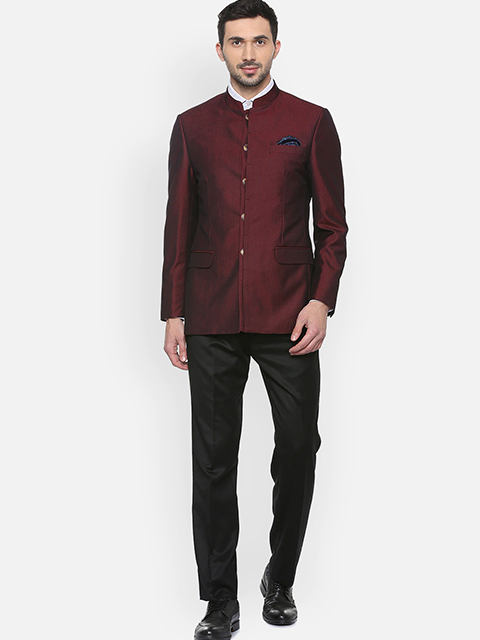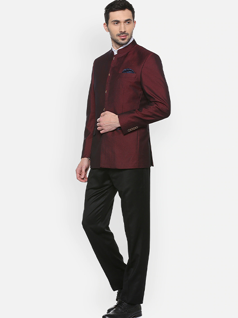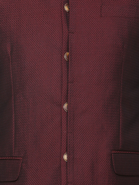 Maroon solid bandh gala blazer, has a mandarin collar, single-breasted with a full button placket, long sleeves, two flap pockets, one chest welt pocket, a double-vented back hem
