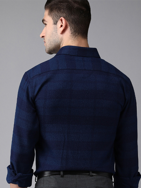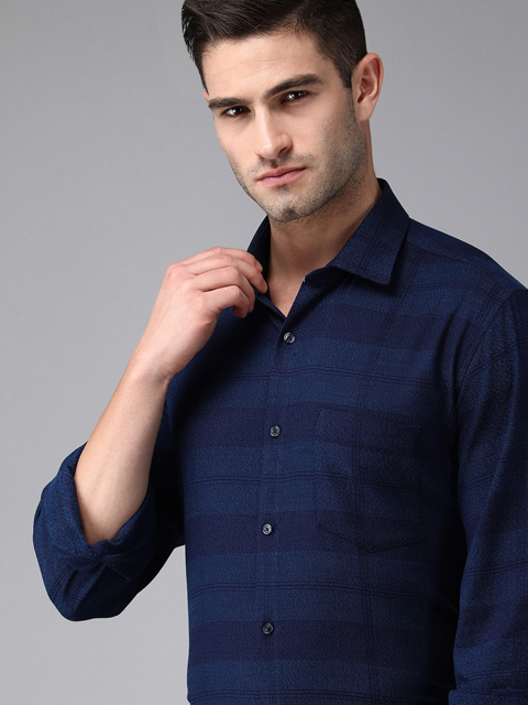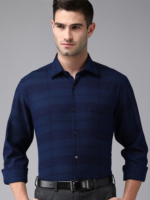 The Blue abstract hecked formal shirt, has a spread collar, button placket, 1 patch pocket, long regular sleeves, curved hem