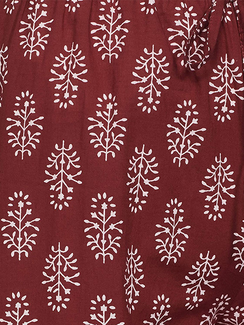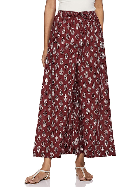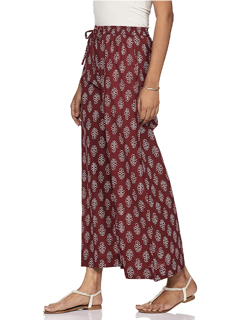 Maroon colored straight fit cotton palazzos with floral print detail and an elasticated waistband.