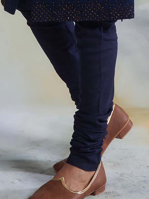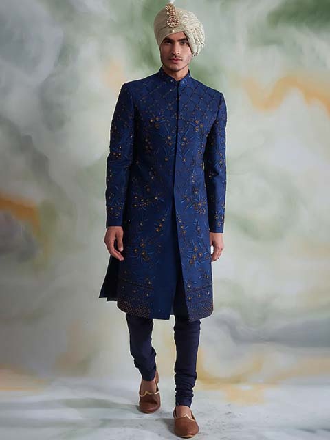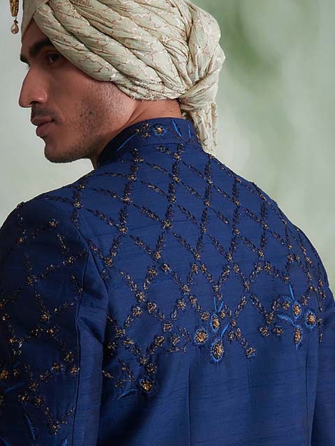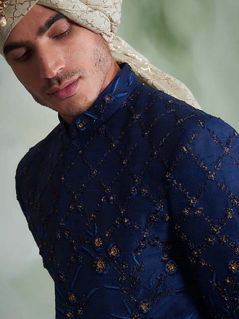 Achkan Set with Navy Blue Leaf Kora Embroidery