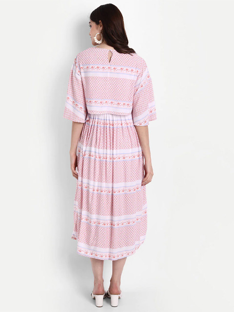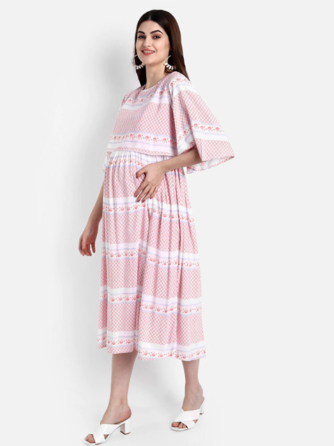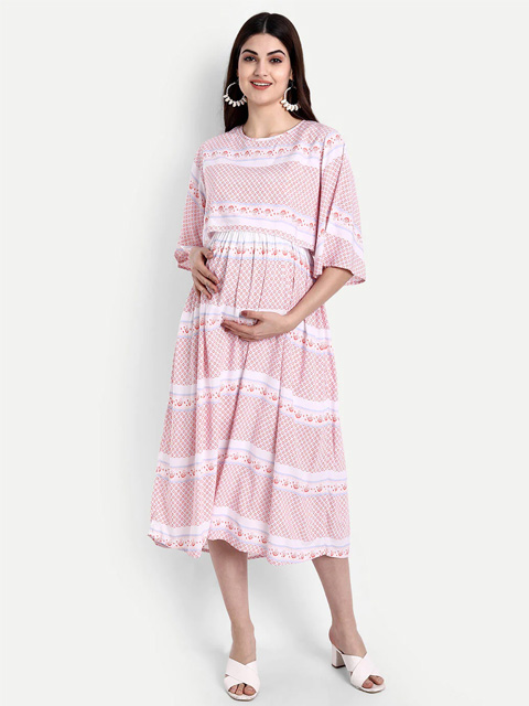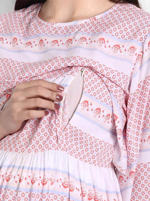 Slip into our long length maternity & nursing maxi this season and flaunt your baby belly. Made in soft lightweight polycrepe fabric, this maxi is crafted in a unique colored pattern. Front zips on both sides allow easy nursing access and packet provides extra comfort.