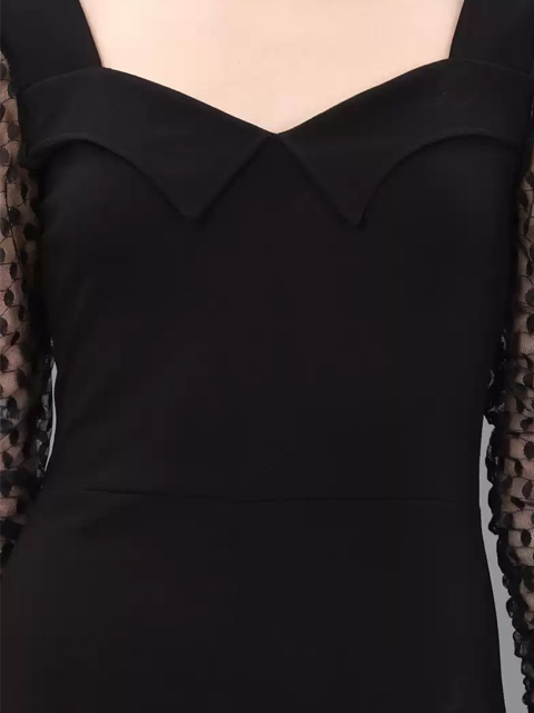 This product is made from polyester and finished in an attractive black color. It features solid pattern, three-fourth sleeve and is targeted towards women. Furthermore, it is recommended to be kept away from extreme heat, fire and corrosive liquids to avoid any form of damage. This dress is both durable and stylish, making it a must-have item. Black can be matched with patent pumps and a pretty purse when you have a Party event to attend.