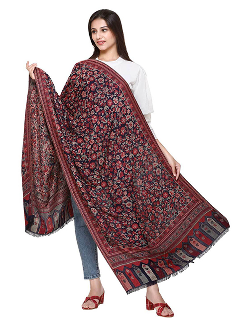 Navy blue, maroon and orange woven design shawl, has tasseled boarder