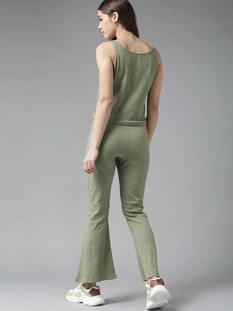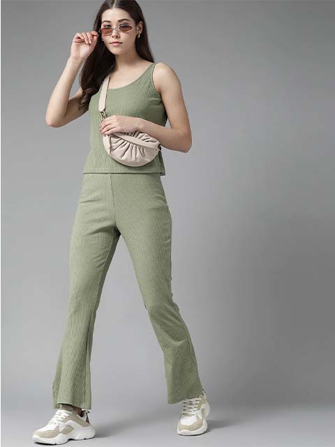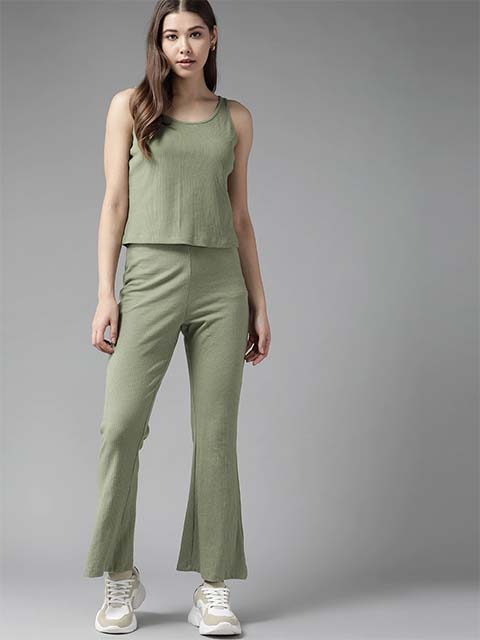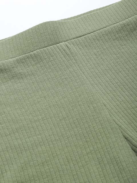 There is a T-shirt and a pair of trousers included in the clothing set. Cropped green ribbed cropped T-shirt with round neck, short sleeves, and green ribbed slip-on trousers with a round neck and sleeveless