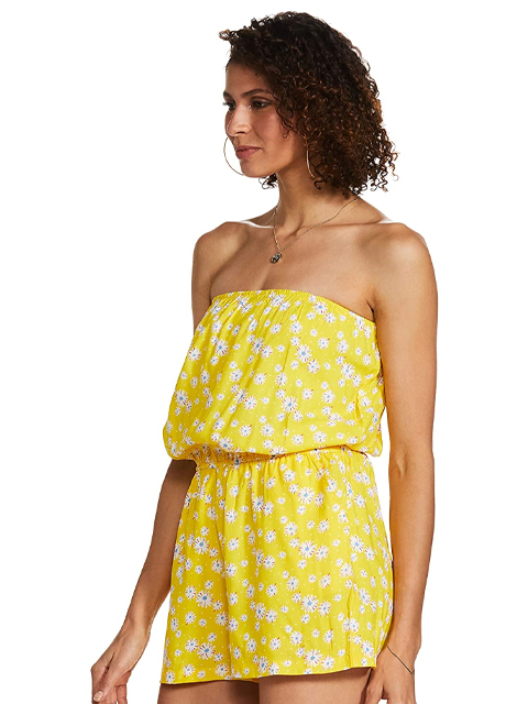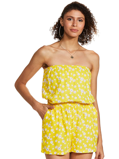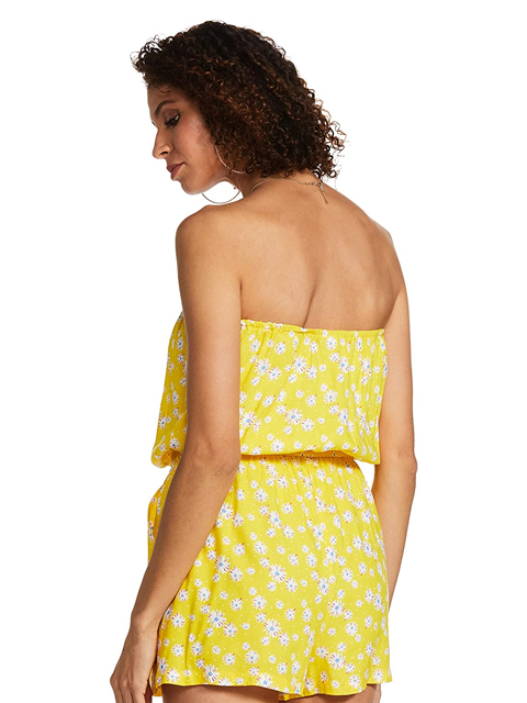 You'll love this women jumpsuit. Yellow and white printed playsuit with Gathers, has a off-shoulder, sleeveless, two pockets