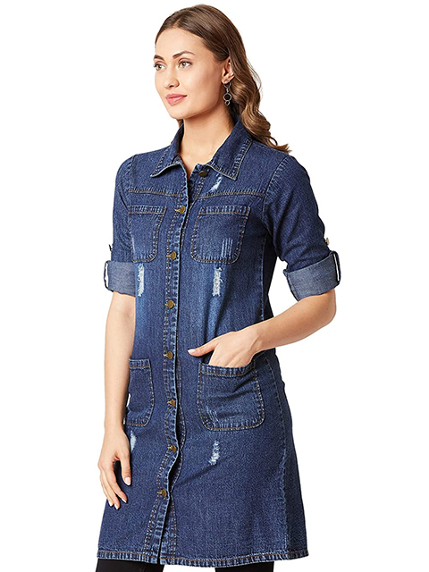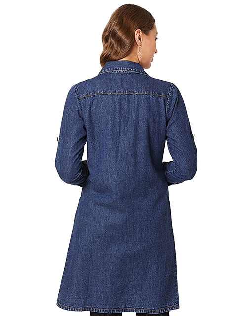 Women's Navy Blue Solid Collared Full Sleeves Denim Knee-Length Jacket